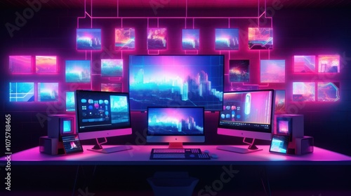 A modern workspace with multiple monitors displaying colorful landscapes and data visualizations.