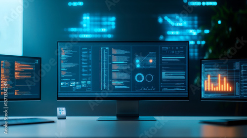 A modern workspace with multiple monitors displaying data analytics, graphs, and code, illuminated by ambient blue lighting.