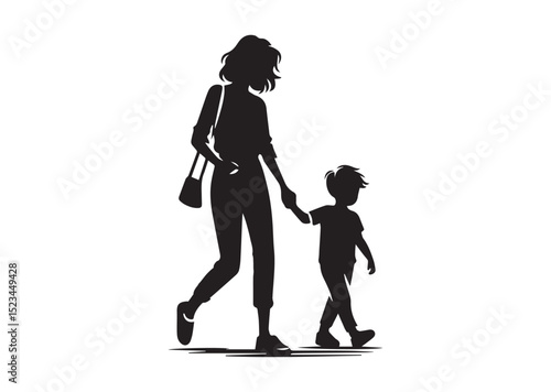 A mommy with a small boy, wear casual outfits, walking holding arms Silhouette Vector