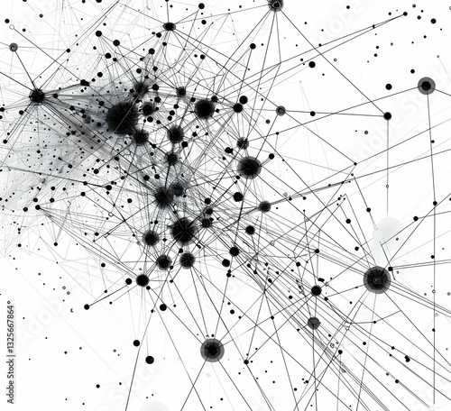 A monochrome conceptual illustration of a network, representing data, connections, and technology with a scientific and analytical aesthetic.