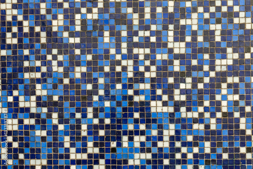 A mosaic pattern made of small square tiles in various shades of blue, black and white. The arrangement appears random, resembling a pixelated digital effect.