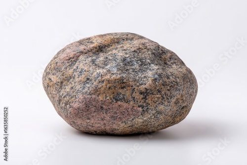 A mottled rounded rock sits on a white surface casting a subtle shadow