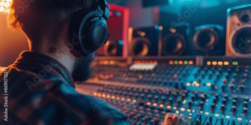 A music producer wearing headphones is working on a sound mixer in a professional studio, surrounded by various high-end audio equipment and ambient lighting.