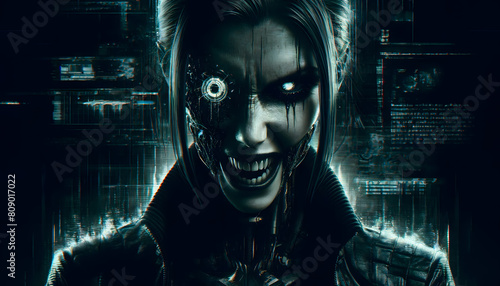 a mysterious and dramatic scene of a hacker, with her face partially obscured by streaming green binary code.