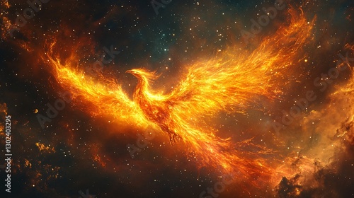 A nebula shaped like a phoenix, burning with vibrant cosmic fire