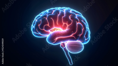A neon digital projection of a human brain highlighting neural connections and activity against a dark background