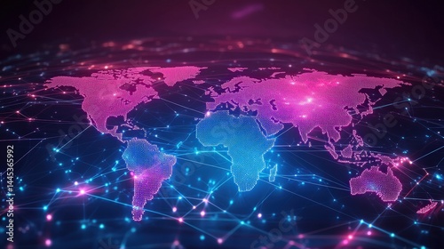 A neon-colored world map with crisscrossing light beams, representing fast and secure global transactions.