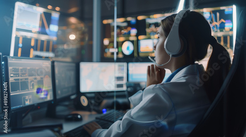 A pensive professional, donned in headphones and a lab coat, intensely focused on multiple screens in a high-tech control room showcasing various data and readings.
