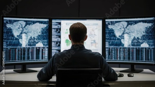 A person analyzes data on multiple screens, displaying maps and charts, in a dimly lit workspace, emphasizing technology and data analysis.