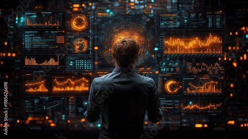 A person analyzing data on a futuristic interface with graphs and visualizations.