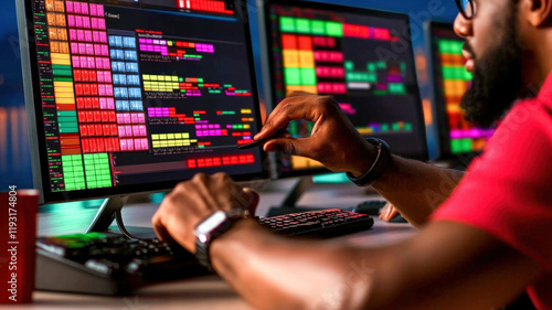 A person analyzing data on multiple computer screens, showcasing colorful charts and code, emphasizing a tech-savvy environment.