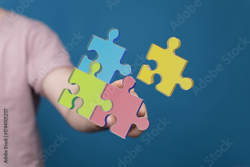 A person holding puzzle pieces illustrating concepts like teamwork, problem-solving, and collaboration. Perfect for business, strategy, and succ