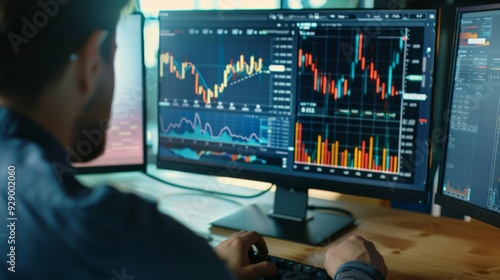 A person intensely analyzing financial data on multiple monitors, with colorful graphs and charts indicating market trends and updates.
