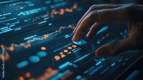 A person interacting with a futuristic, touch-sensitive display showing various digital data graphs and interface elements, suggesting high-tech data analysis or control panel operation.