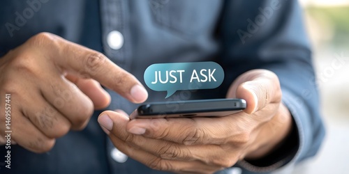 A person interacts with a smartphone, a digital speech bubble prompts users to simply "JUST ASK", emphasizing ease and accessibility in communication.
