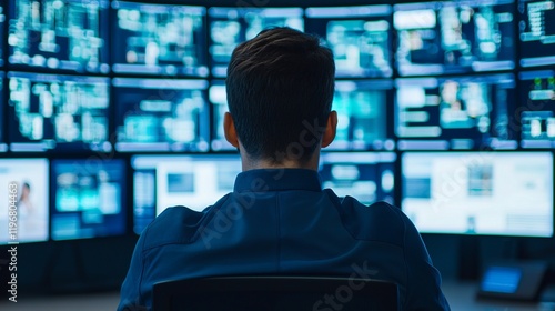 A person is seated in front of multiple monitors displaying various data and graphics, focused on information analysis in a high-tech environment.