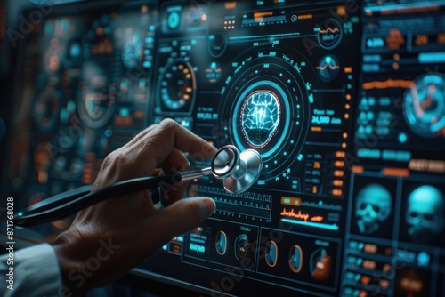 A person is using a stethoscope on a computer monitor