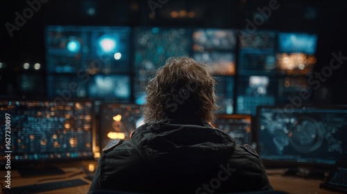 A person sits in front of multiple screens displaying data and graphics, creating a high-tech, immersive environment.