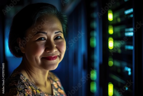 A person standing near computer equipment, suitable for use as a metaphor or illustration