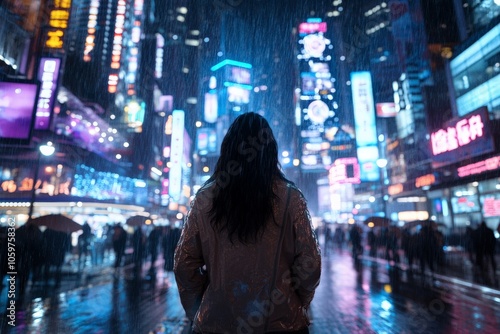 A person stands amid a vibrant city bustling with neon lights, surrounded by rain, capturing the essence of urban life and human emotion in a digital age.