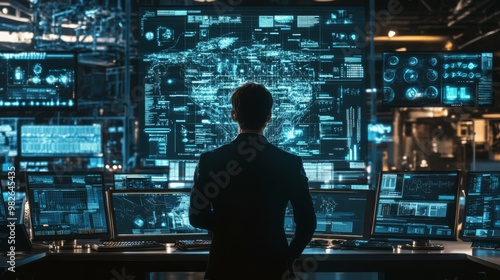 A person stands in front of multiple screens displaying futuristic data and graphics, immersed in a digital environment.