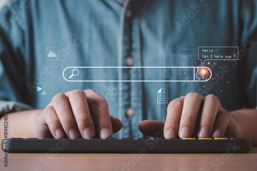 A person typing on a keyboard with a futuristic AI search interface and digital assistant icons for artificial intelligence smart search technology human interaction automation and digital innovation