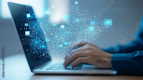 A person typing on a laptop with digital data visualizations emerging from the screen.