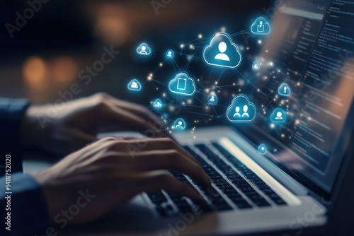 A person using a laptop connected to a cloud network