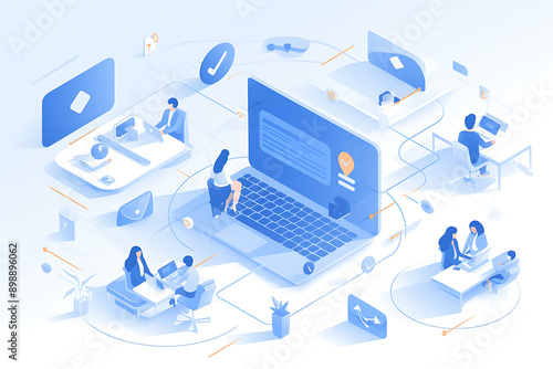 A person using a laptop with glowing digital interface icons representing emails, data transfer, and cloud computing.