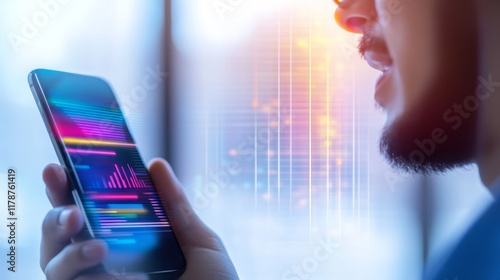 A person using a smartphone displaying data analytics or graphs.
