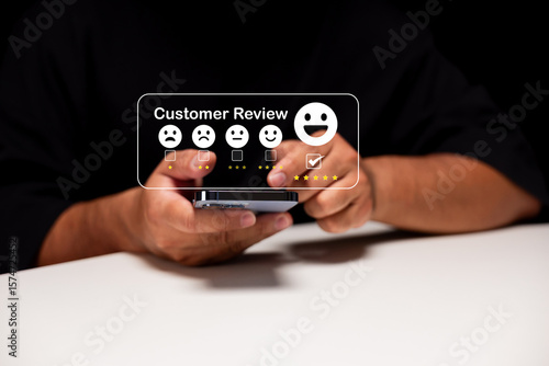 A person using a smartphone to select a positive five-star customer review with happy emoticons hovering above the device.