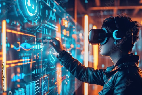 A person using virtual reality technology, interacting with a digital interface.