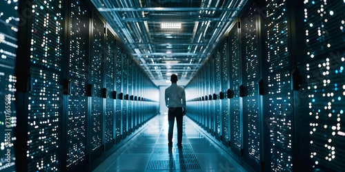 A person working in a server room surrounded by powerful machinery and digital consoles, with (interlocking circuits and algorithm patterns composing the backdrop