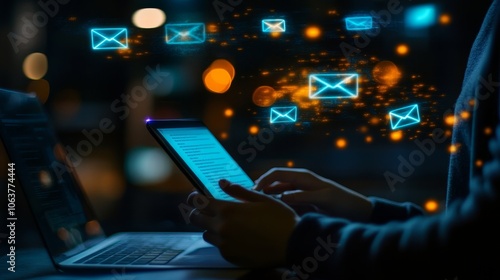 A person working late at night, using a laptop and tablet, with glowing email notifications representing busy communication and connection.