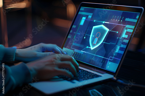 A person's hands are typing on their laptop with an abstract digital shield and keyhole icon hovering above a keyboard. Concepts of network security, private access, and data protection.