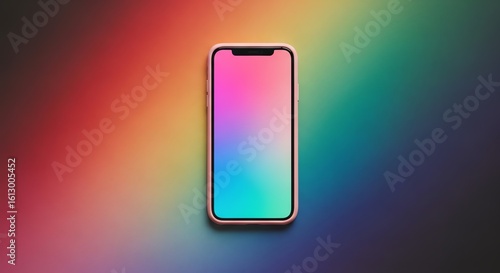 A pink smartphone with a vibrant gradient screen sits on a multicolored blurred background.