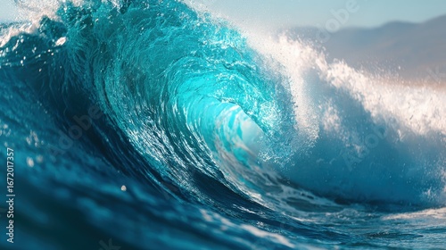 A powerful ocean wave crashes, showcasing the vibrant turquoise water and dynamic motion.