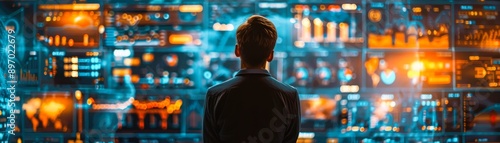 A professional analyzing data on a digital display, surrounded by glowing graphics and complex information.