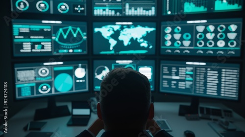 A professional analyzing data on multiple screens in a dark room, focused on global analytics and performance metrics.