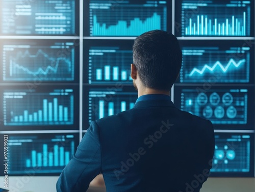 A professional analyzing data on multiple screens, showcasing modern technology in business and analytics environments.