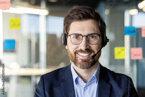 A professional businessman in a suit works in a contemporary office setting, exuding confidence and expertise.