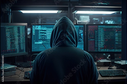 A professional hacker in a hood is working on hacking servers and websites. A hacker works in a multi-monitor environment while hacking into a server. Generative AI