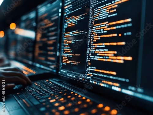 A professional IT specialist working at a computer setup displaying multiple screens filled with code, featuring a tech-savvy and focused atmosphere.