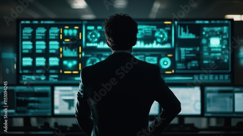 A professional observing multiple high-tech screens displaying data and analytics in a modern workspace.