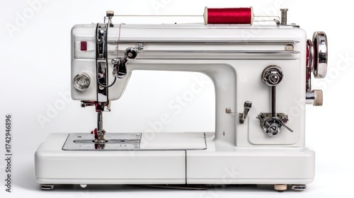 a professional sewing machine with a red thread spooled onto it