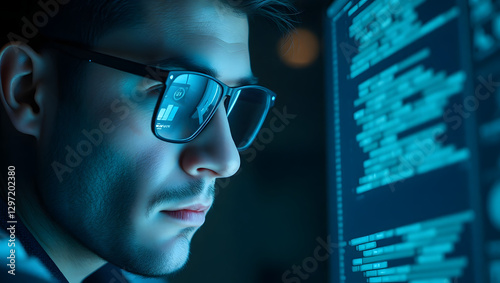 a programmer focused on coding while wearing glasses. The monitor displays code that is highlighted.