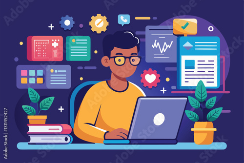 A programmer focuses on coding and testing while surrounded by digital tools and plants in a vibrant workspace, Programmer concept idea of coding testing and writing program using device