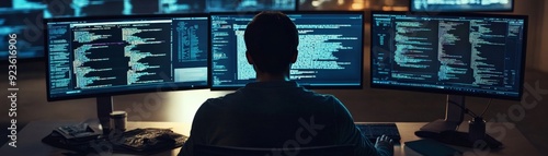 A programmer working at a multi-monitor setup, coding and analyzing on multiple screens in a dimly lit room, managing complex software projects.