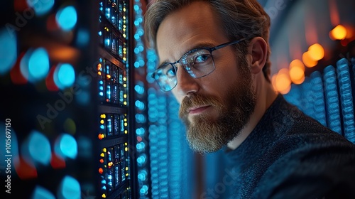 A programmer working in a data center office, focused on managing computer systems and ensuring tech efficiency.