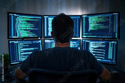 A programmer working on multiple monitors, surrounded by code, in a modern workspace.
